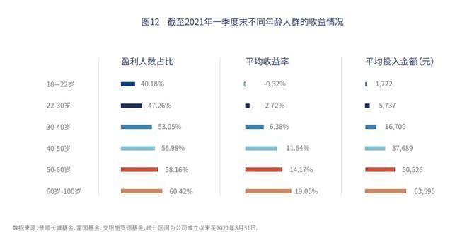 根据景顺长城基金、富国基金、交银施罗德基金三家基金管理公司携手中国证券报发布的《公募权益类基金投资者盈利洞察报告》,截至去年3月底,60岁以上投资者平均收益率达到19.05%,是年轻人的6倍多,盈利人数占比达60.42%。而反观年轻人,30岁以下投资者平均收益率不到3%,盈利人数占比不到50%。